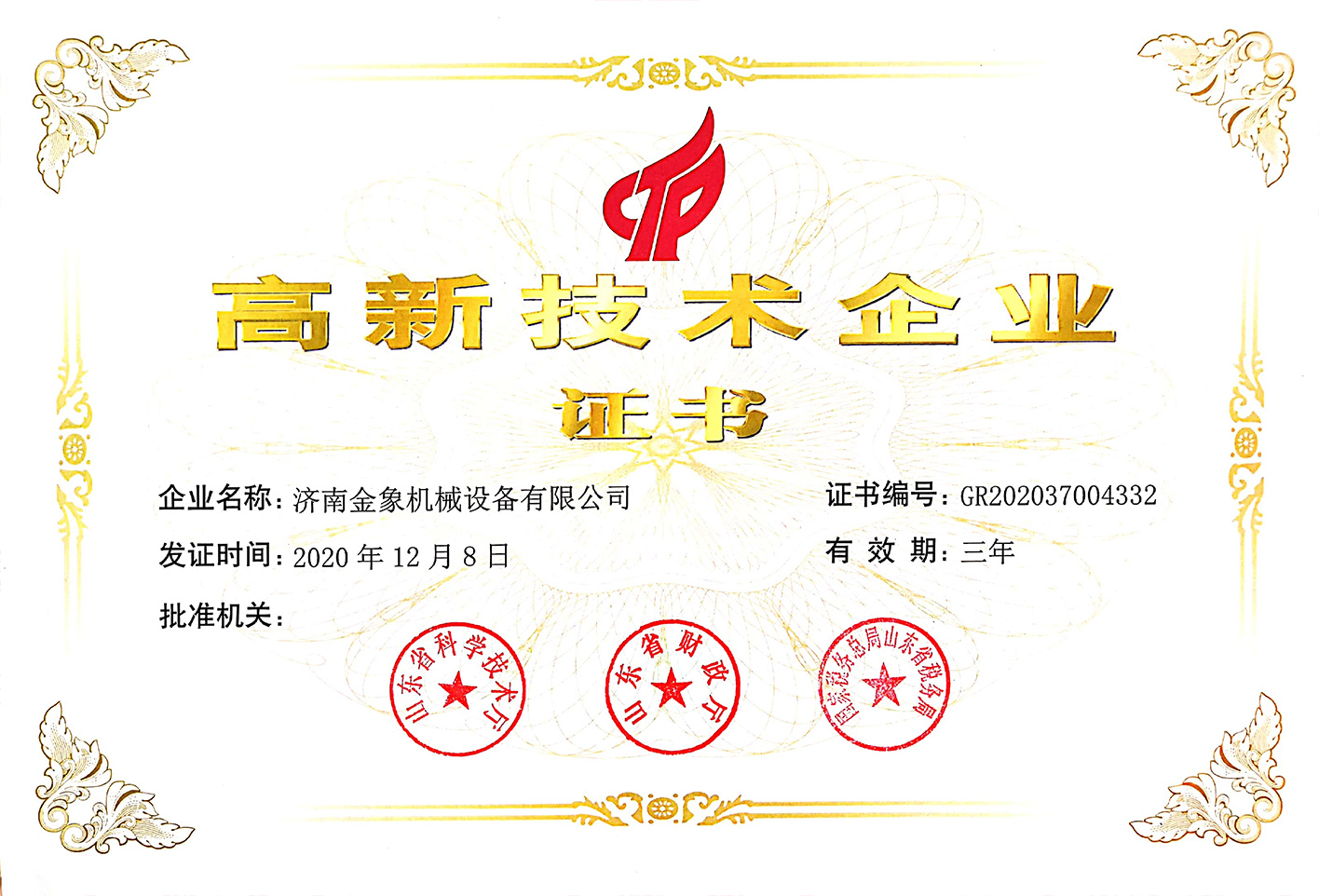 根據(jù)國家《高新技術(shù)企業(yè)認(rèn)定管理辦法》和《高新技術(shù)企業(yè)認(rèn)定管理工作指引》的相關(guān)規(guī)定,濟(jì)南金象機(jī)械設(shè)備有限公司被認(rèn)定為國家級高新技術(shù)企業(yè)。